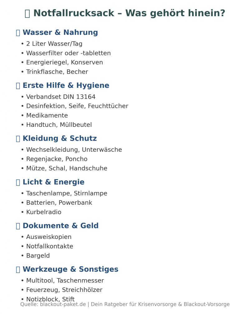 💡 Wichtig: Ein Notfallrucksack ist keine Panikmache, sondern ein Stück Vorsorge – empfohlen u. a. vom Bundesamt für Bevölkerungsschutz und Katastrophenhilfe (BBK).