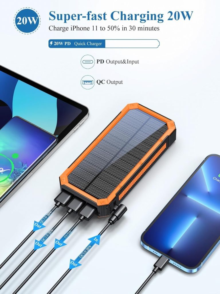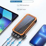• Powerbank mit Solar– 3A Schnellladung, 20000 mAh, Zwei Lademethoden, Solarenergie/USB, 2-USB-A-AusgangsanschlĂĽsse,1-USB-C-Eingangs- und Ausgang, 18 x 2 x 5 cm